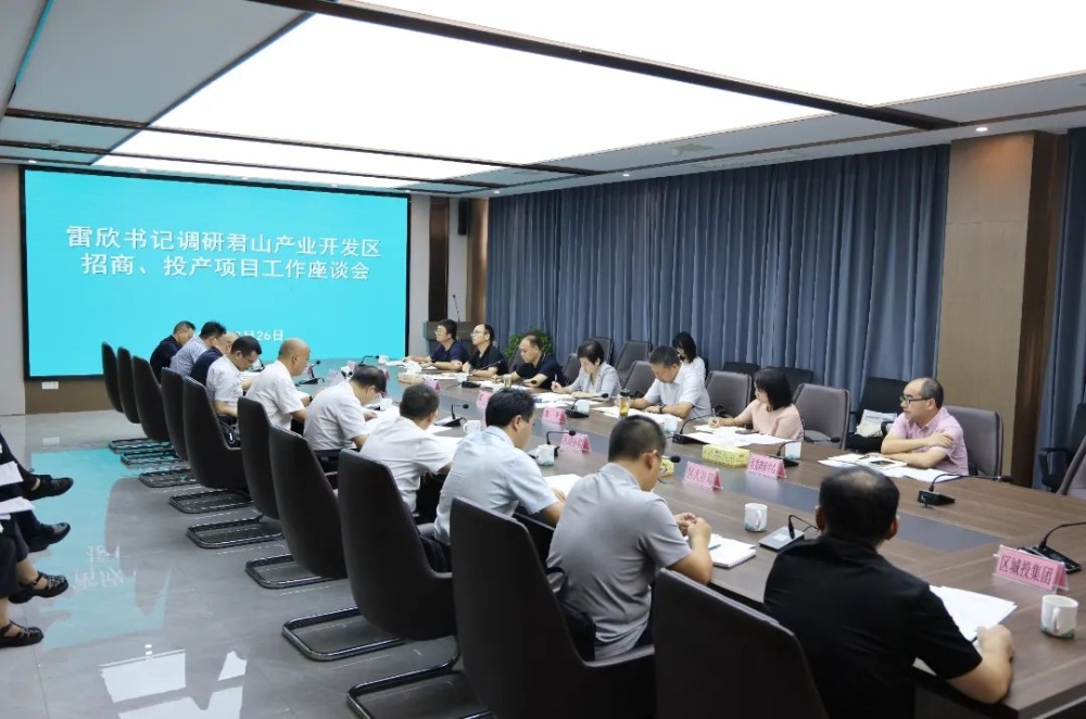 △8月26日,雷欣調(diào)研君山產(chǎn)業(yè)開發(fā)區(qū)招商、項(xiàng)目投產(chǎn)工作座談會(huì)。竺芳梓 攝