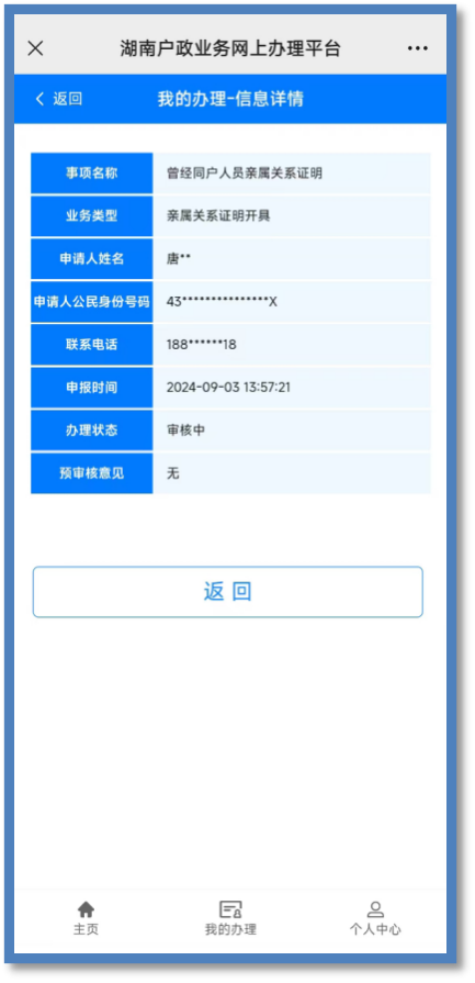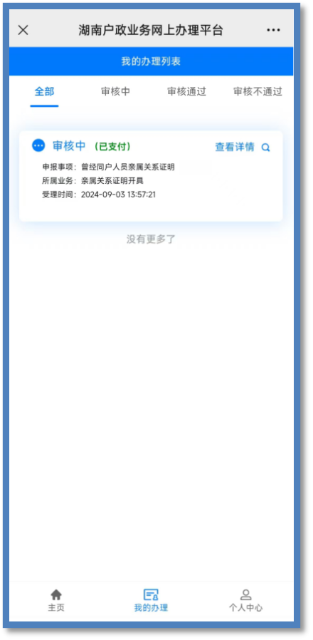 三、短信通知。申請(qǐng)人也可在平臺(tái)首頁“我的辦理”中查詢?cè)斍椤?/p>