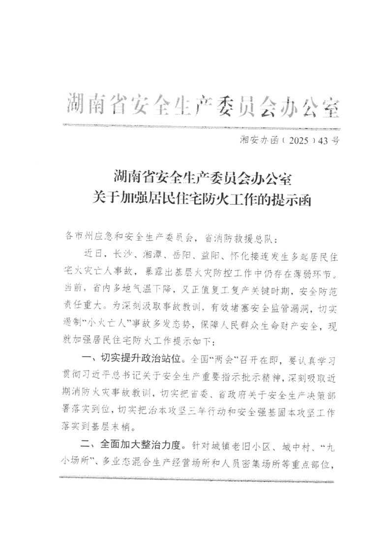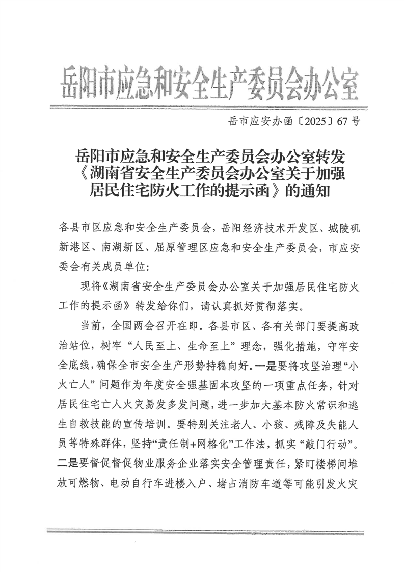 岳陽市應急和安全生產委員會辦公室轉發(fā)《湖南省安全生產委員會辦公室關于加強居民住宅防火工作的提示函》的通知