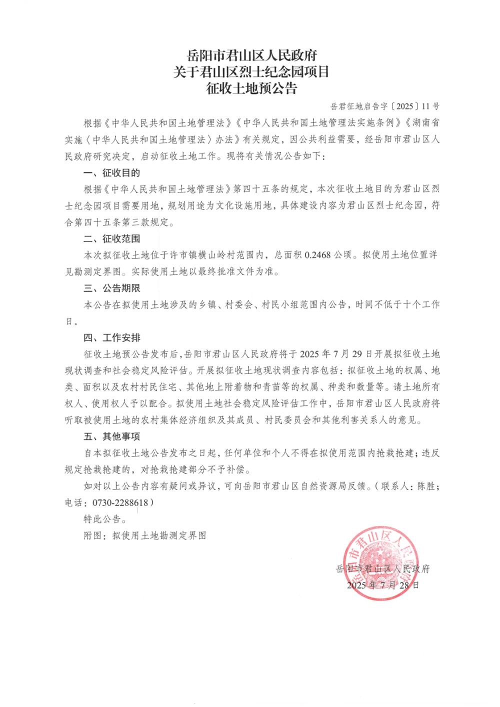 關(guān)于君山區(qū)烈士紀(jì)念園項(xiàng)目征收土地預(yù)公告、擬征收土地補(bǔ)償安置方案公告、勘測(cè)定界圖的公示