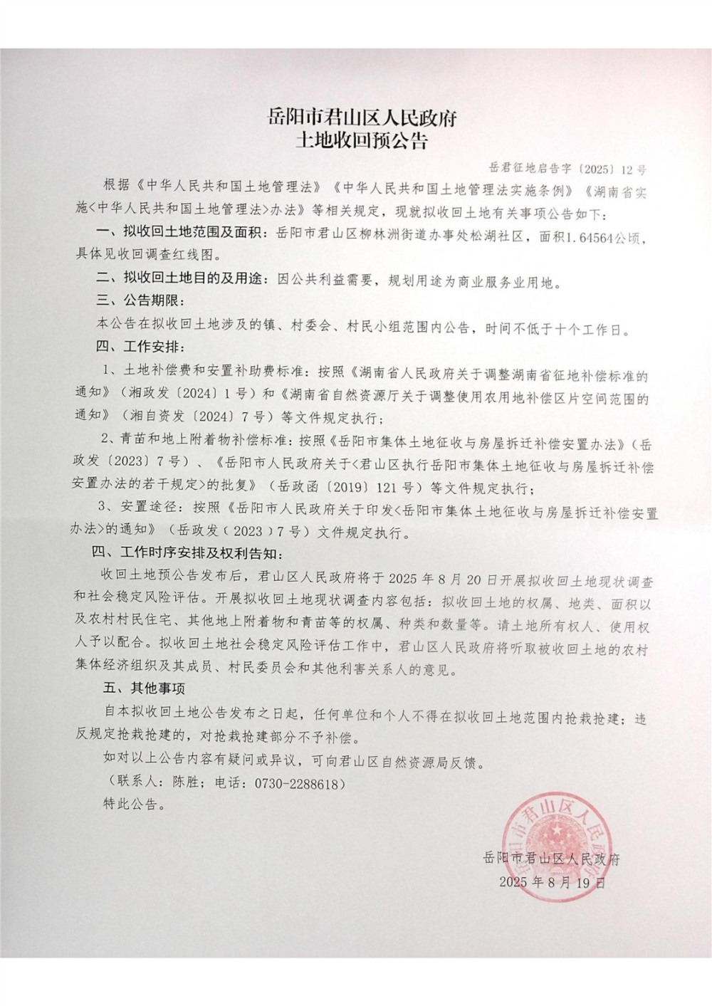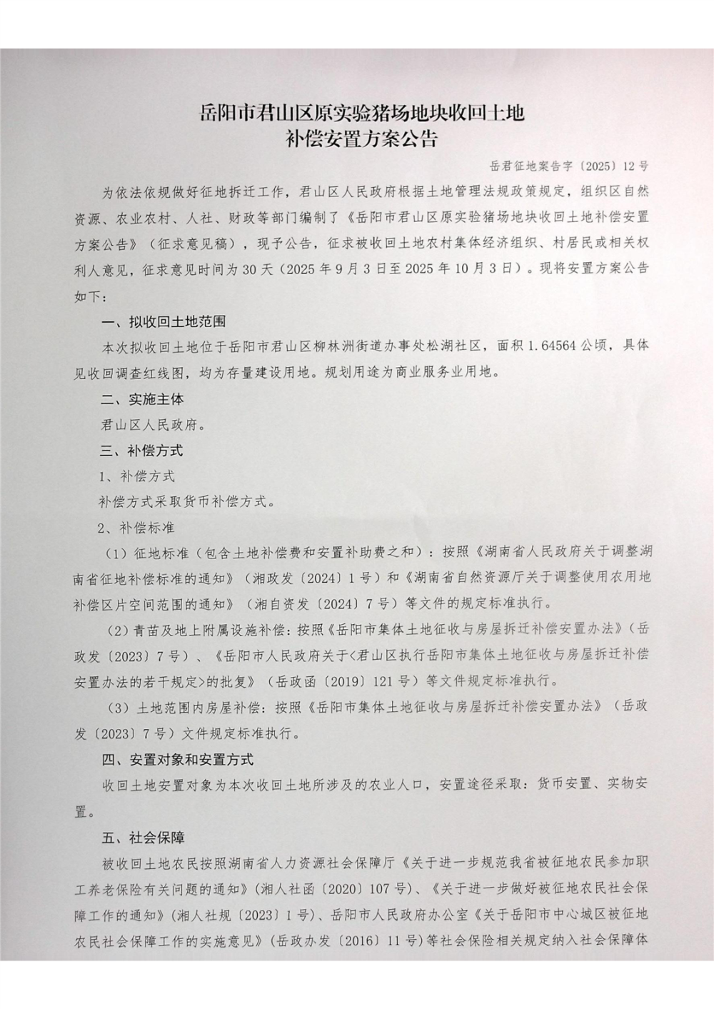 關(guān)于岳陽(yáng)市君山區(qū)原實(shí)驗(yàn)豬場(chǎng)地塊土地收回預(yù)公告、補(bǔ)償安置方案公告、調(diào)查紅線(xiàn)圖公示