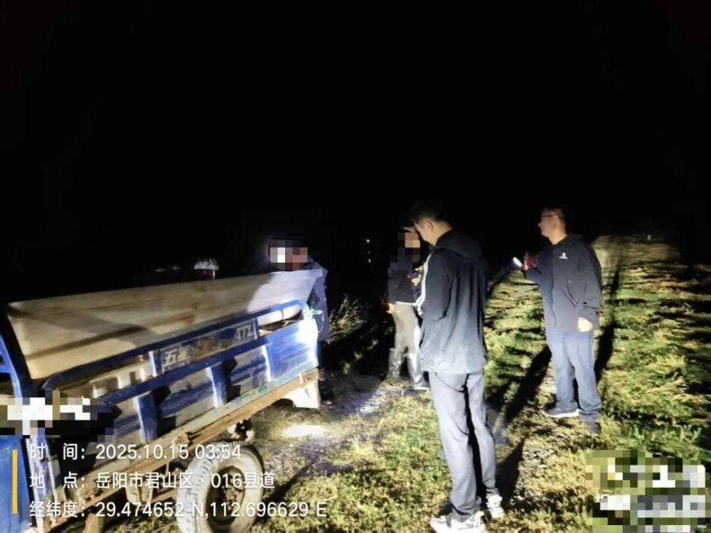 當日凌晨2時許,君山分局錢糧湖派出所民輔警在重點水域巡邏過程中,在華容河錢糧湖段禁漁禁捕區(qū)發(fā)現(xiàn)有兩名男子正在劃船且四處張望、行跡可疑。該所巡邏民警曹龍、賀鑫望繼續(xù)沿途查證,通過觀察分析,發(fā)現(xiàn)該兩名男子正在使用網(wǎng)具實施非法捕撈行為。