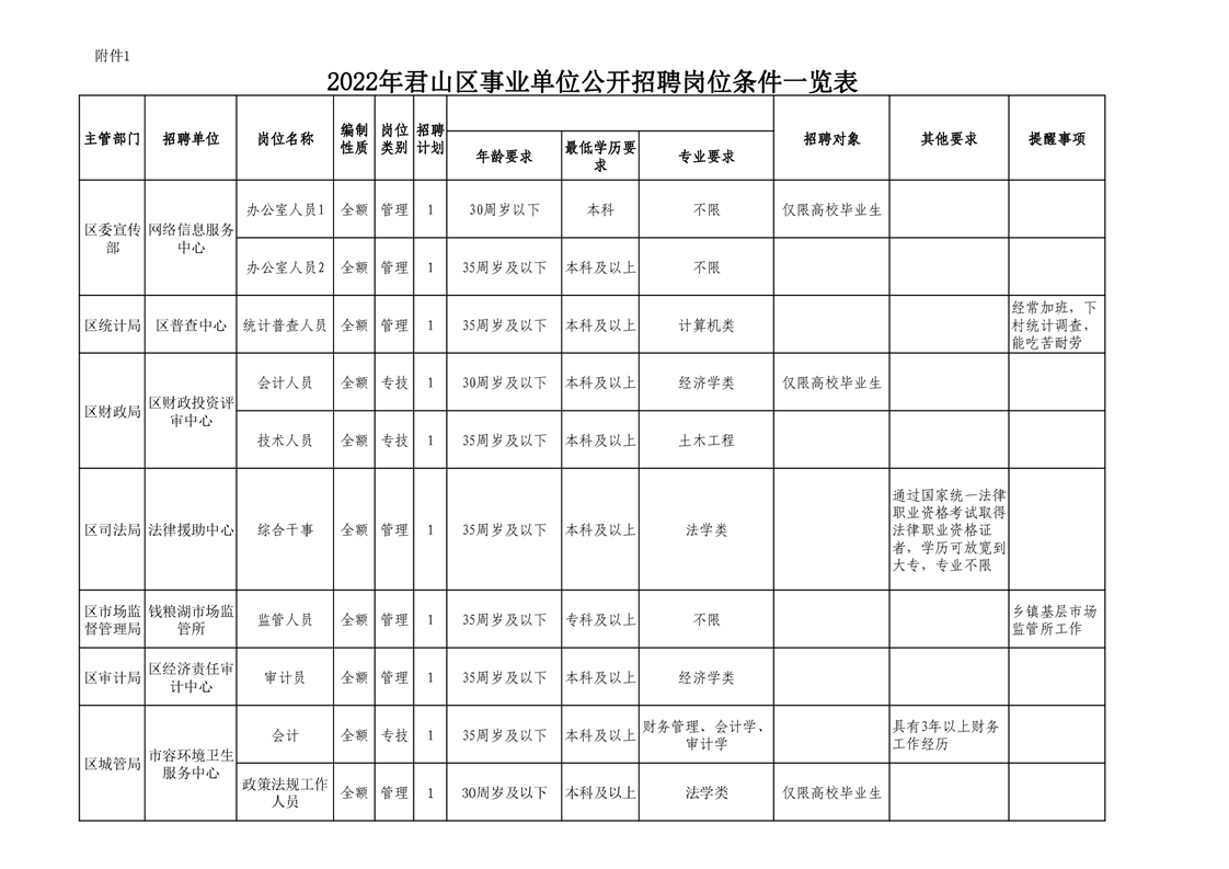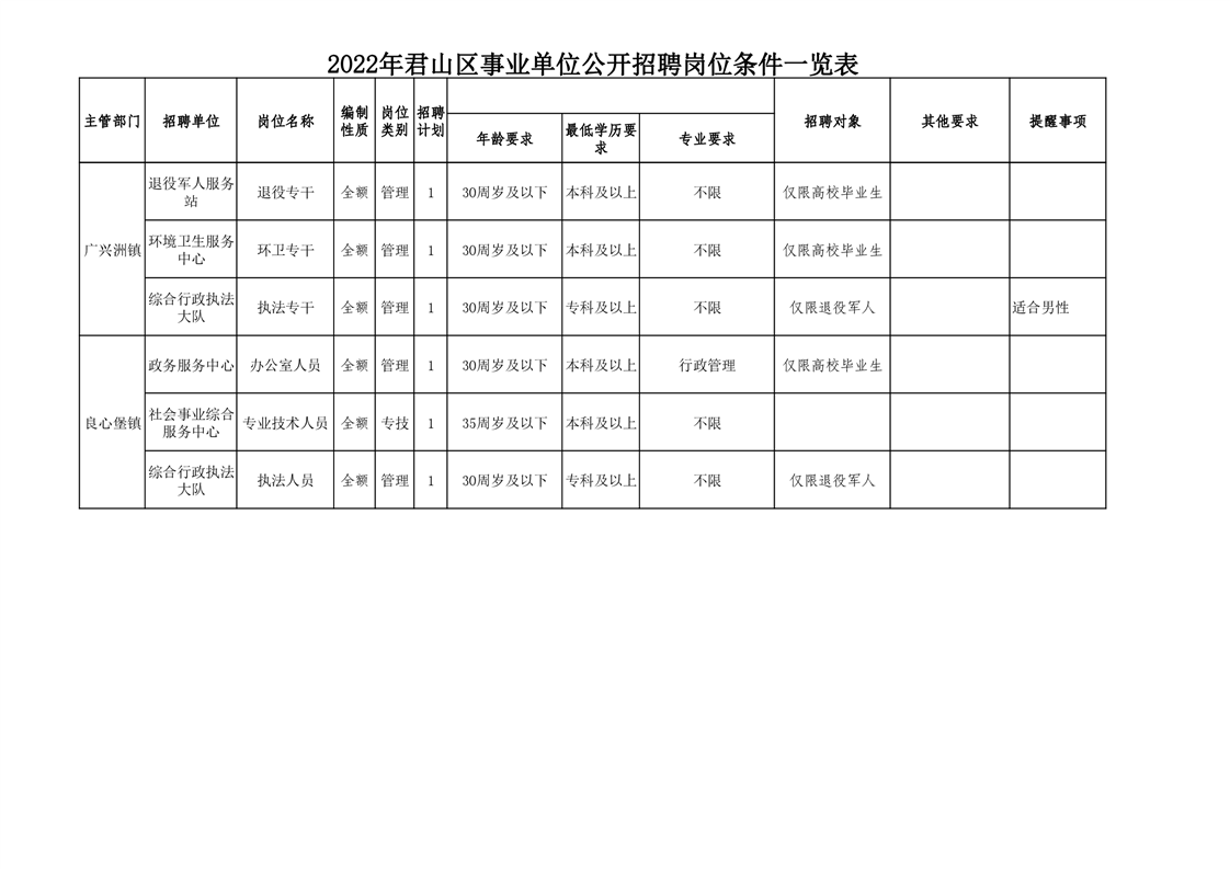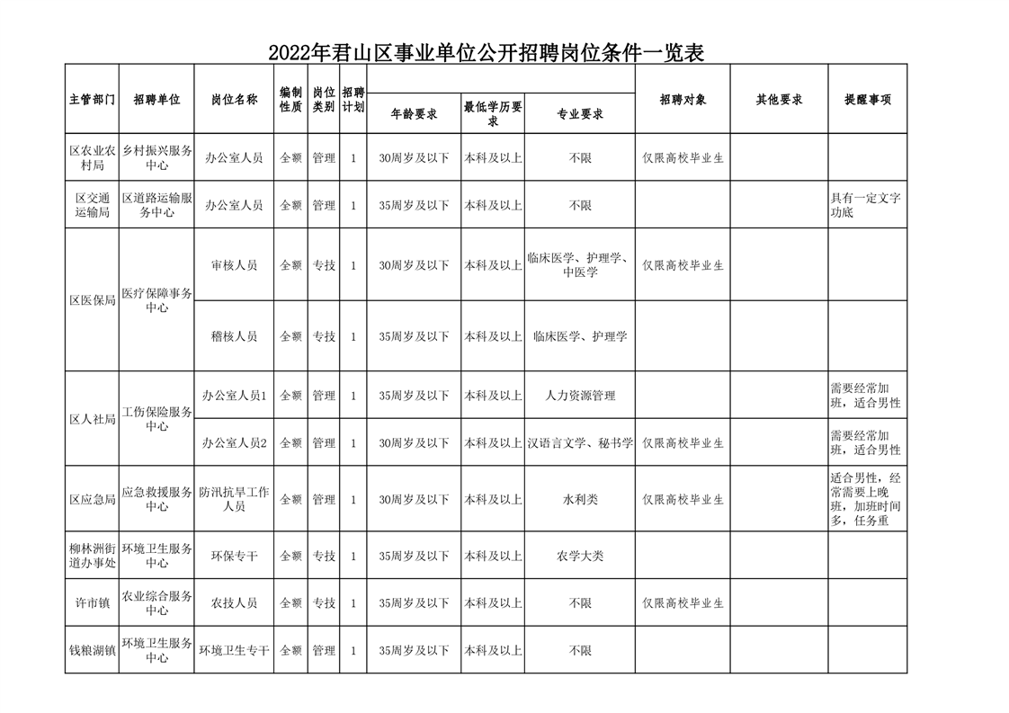 具體招聘崗位、計劃及要求詳見《2022年君山區(qū)事業(yè)單位公開招聘崗位表》(附件1)。