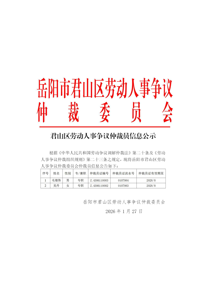 君山區(qū)勞動(dòng)人事?tīng)?zhēng)議仲裁員信息公示