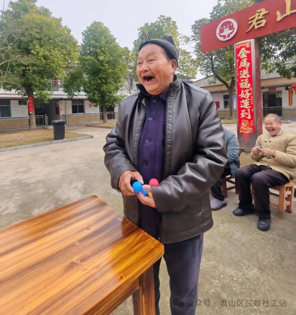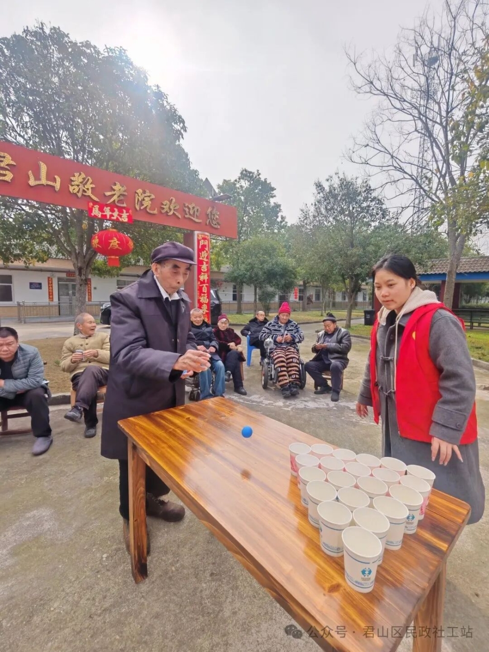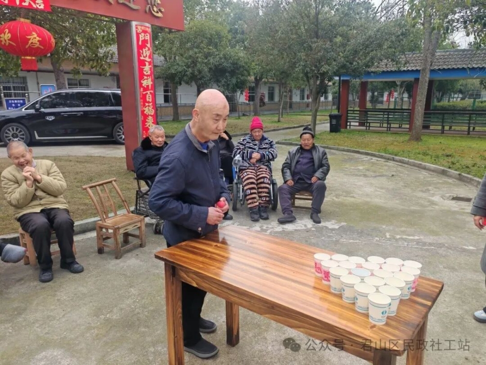 手勢舞熱身完,一場趣味紙杯投球游戲開始了。老人在桌前專注操作,其他人或凝神觀看,或躍躍欲試。簡單的紙杯投球游戲,既鍛煉了手眼協(xié)調(diào),又讓老人們在互動中收獲了快樂和陪伴,整個敬老院里充滿歡聲笑語,暖意融融。
