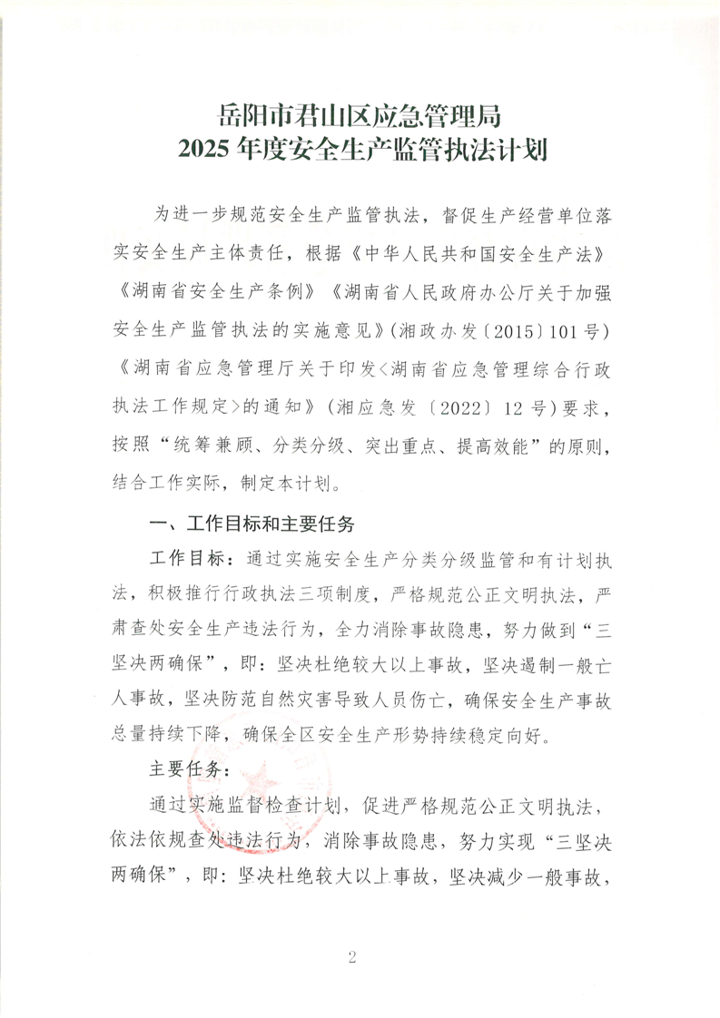 君山區(qū)應(yīng)急管理局2025年度安全生產(chǎn)監(jiān)管執(zhí)法計(jì)劃(岳君應(yīng)急【2025】4號)