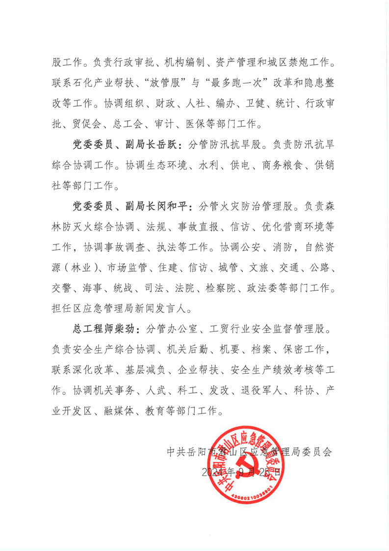 關(guān)于調(diào)整局領(lǐng)導班子分工的通知(岳君應(yīng)急委【2024】2號)