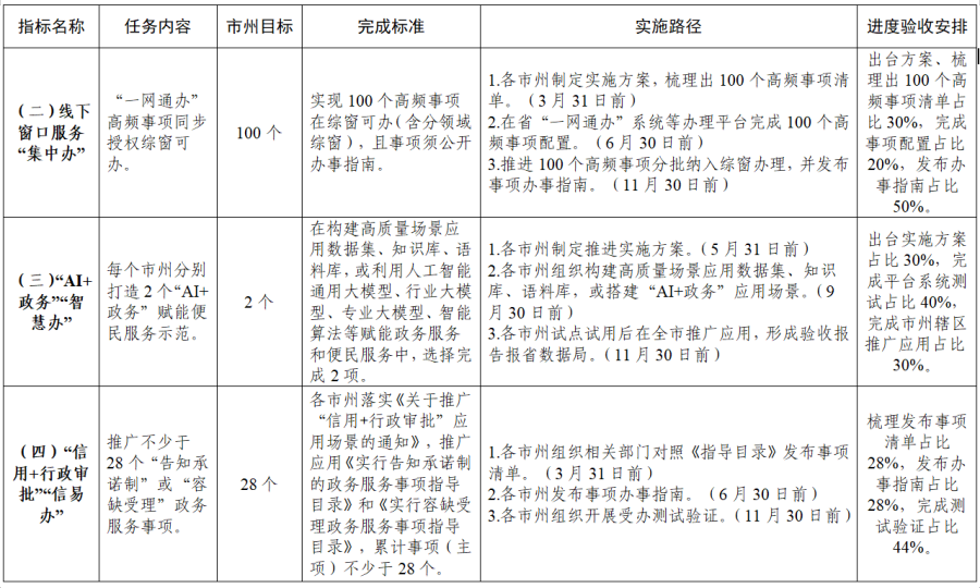7.實(shí)施“數(shù)字便民工程”。以重點(diǎn)民生實(shí)事為牽引,著力推動(dòng)線上政務(wù)服務(wù)“高效辦”、線下窗口服務(wù)“集中辦”、“AI+政務(wù)”“智慧辦”、“信用+行政審批”“信易辦”(指標(biāo)任務(wù)分解表見附件)。