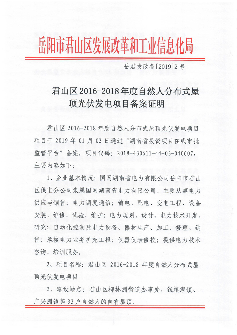君山區(qū)2016-2018年度自然人分布式光伏發(fā)電項(xiàng)目備案證明