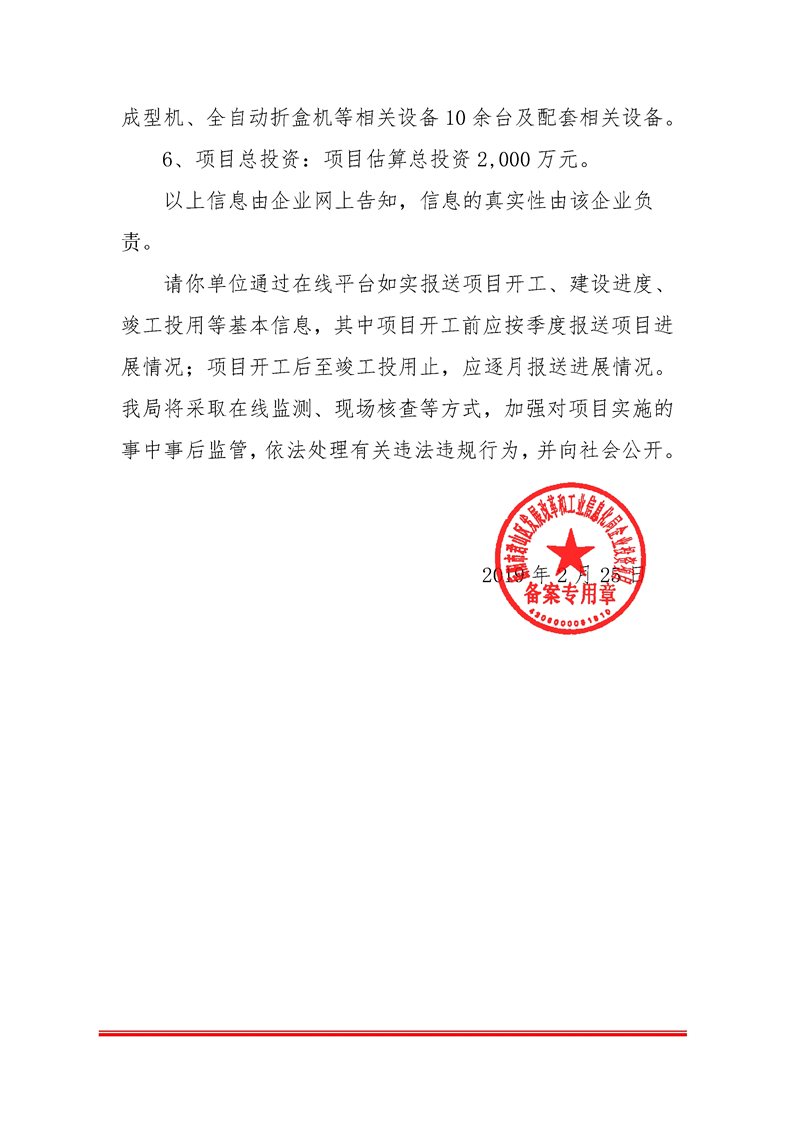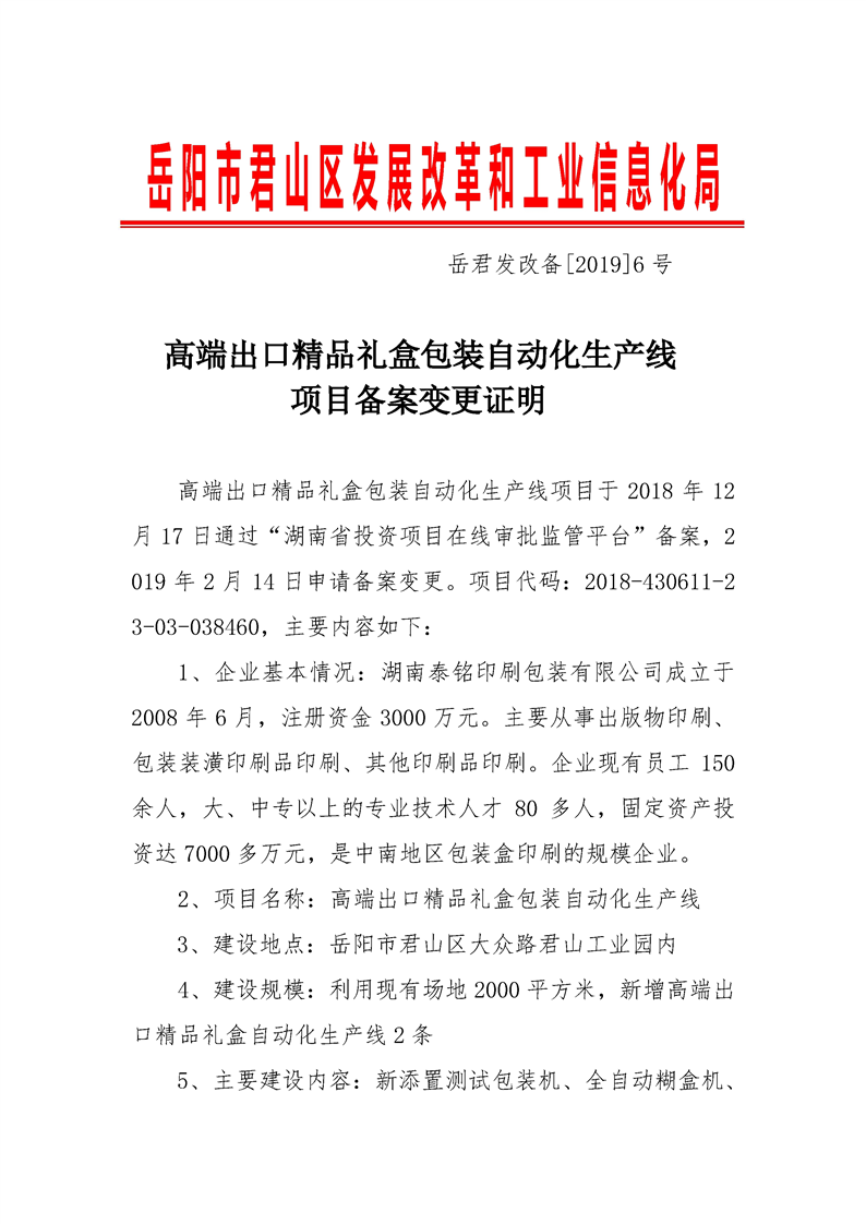 高端出口精品禮盒包裝自動化生產(chǎn)線備案變更證明