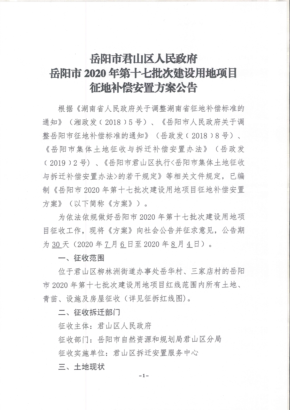 岳陽(yáng)市君山區(qū)人民政府岳陽(yáng)市2020年第十七批次建設(shè)用地項(xiàng)目征地補(bǔ)償安置方案公告