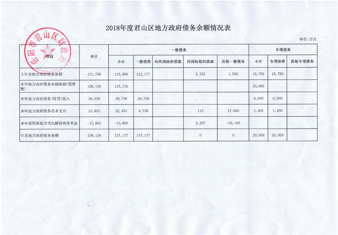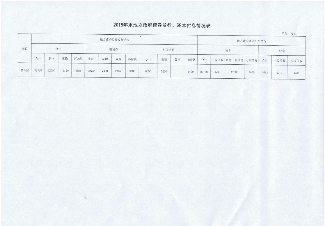 2018年度君山區(qū)地方政府債務(wù)余額情況表及2018年末地方政府債券發(fā)行、還本付息情況表
