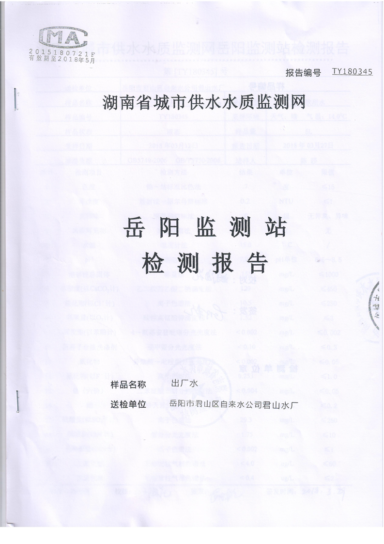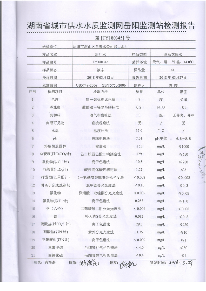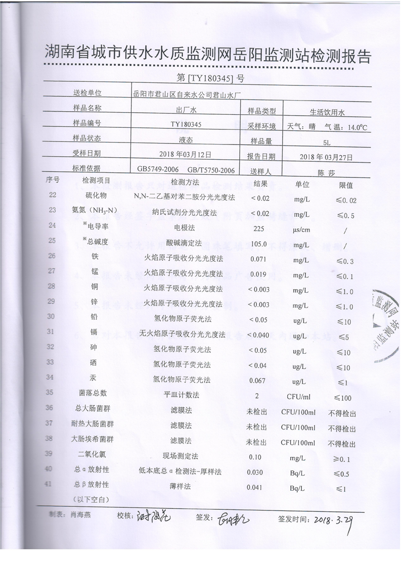 君山區(qū)自來(lái)水公司2018年3月水質(zhì)監(jiān)測(cè)結(jié)果