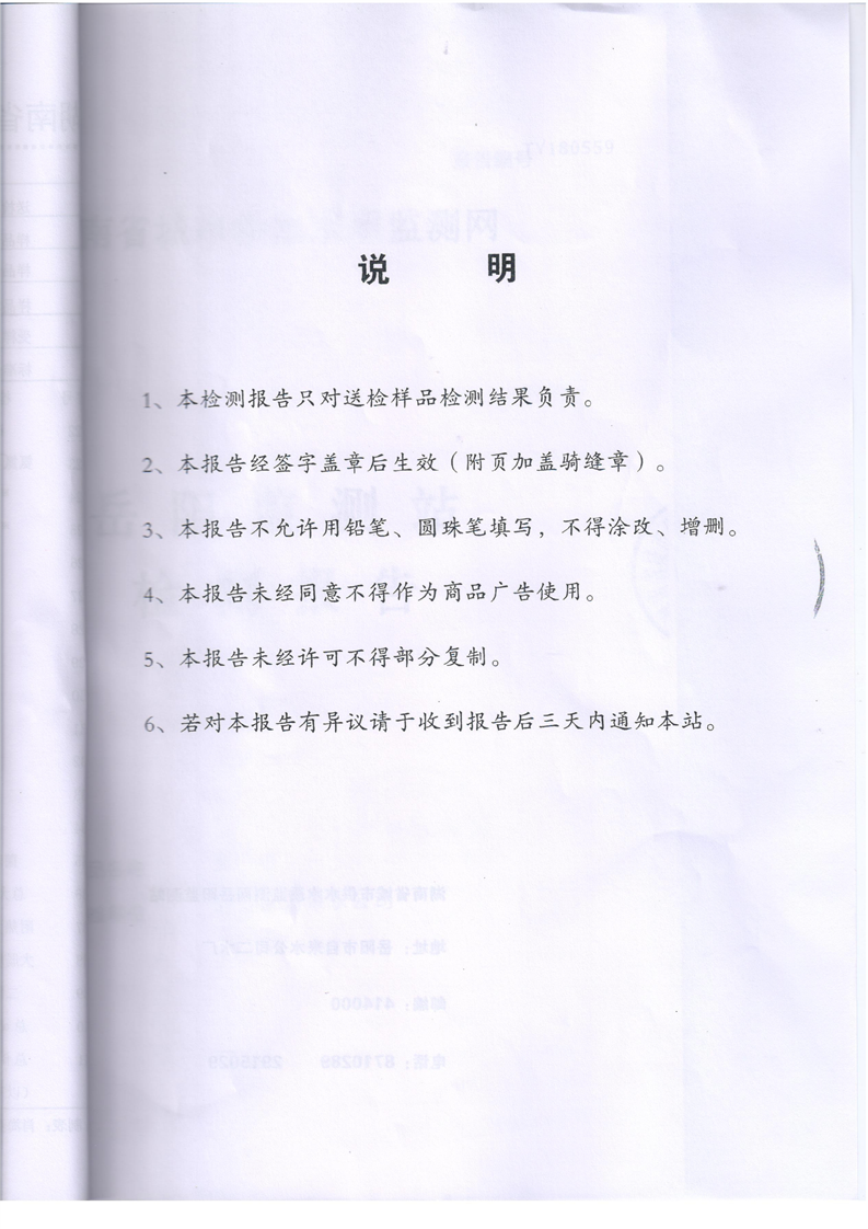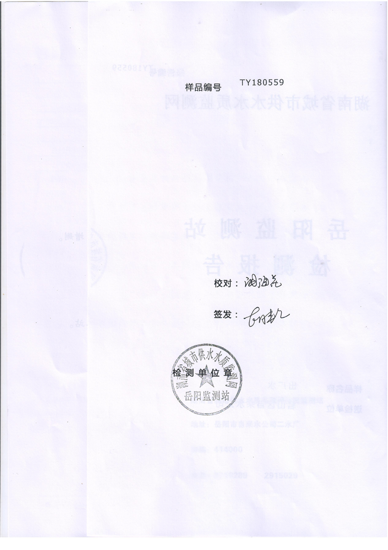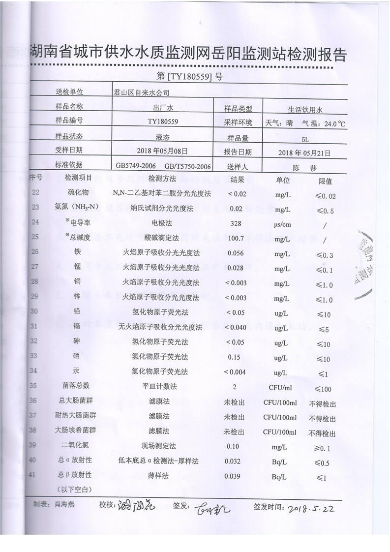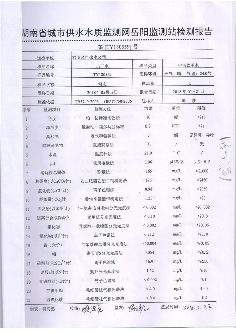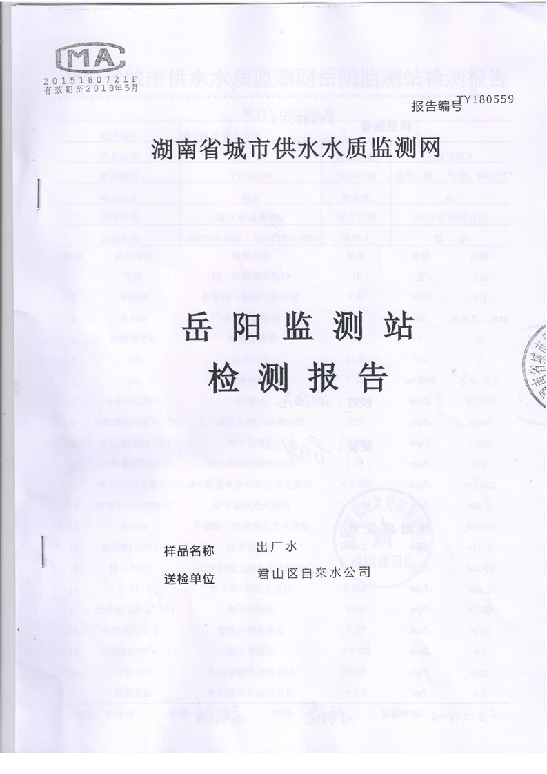 君山區(qū)自來水公司2018年5月水質(zhì)監(jiān)測結(jié)果