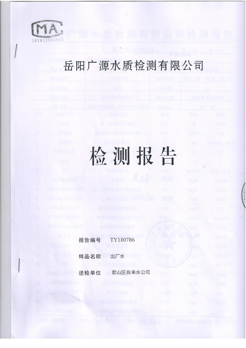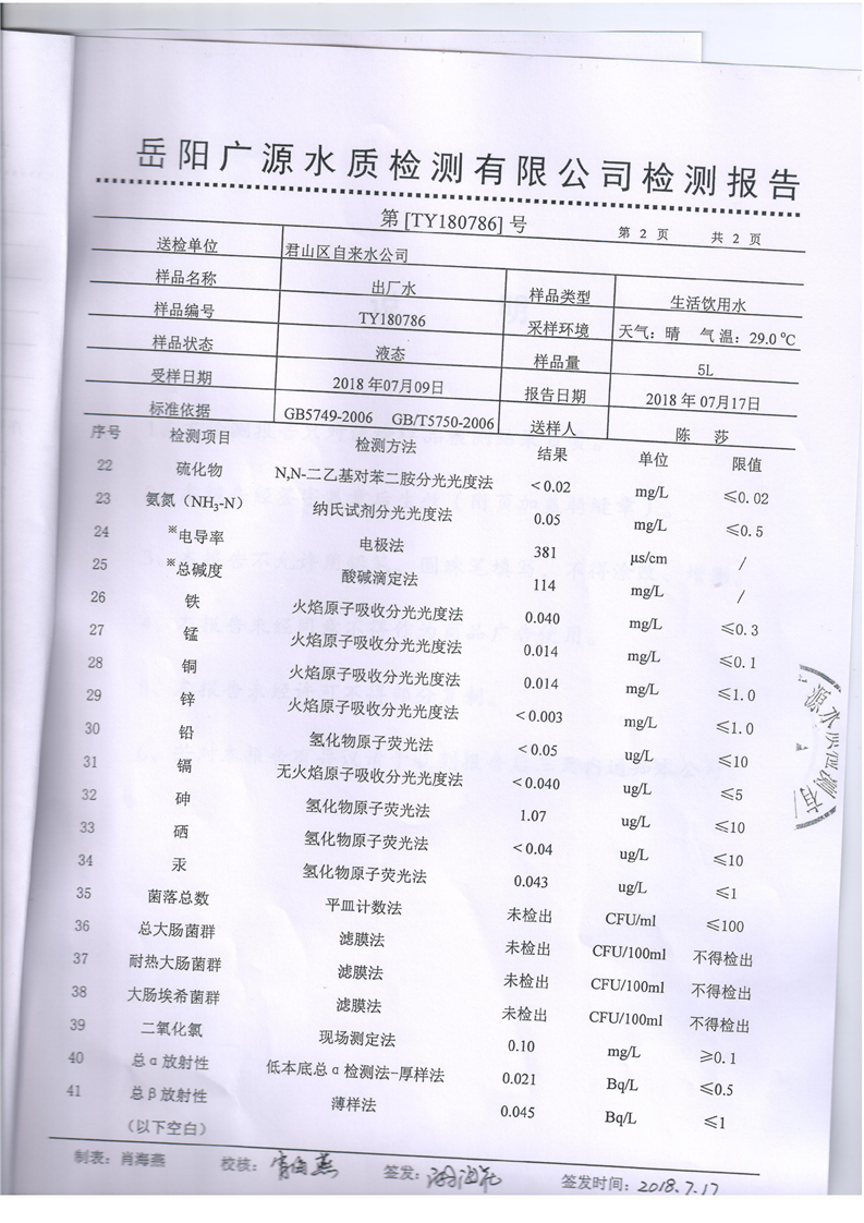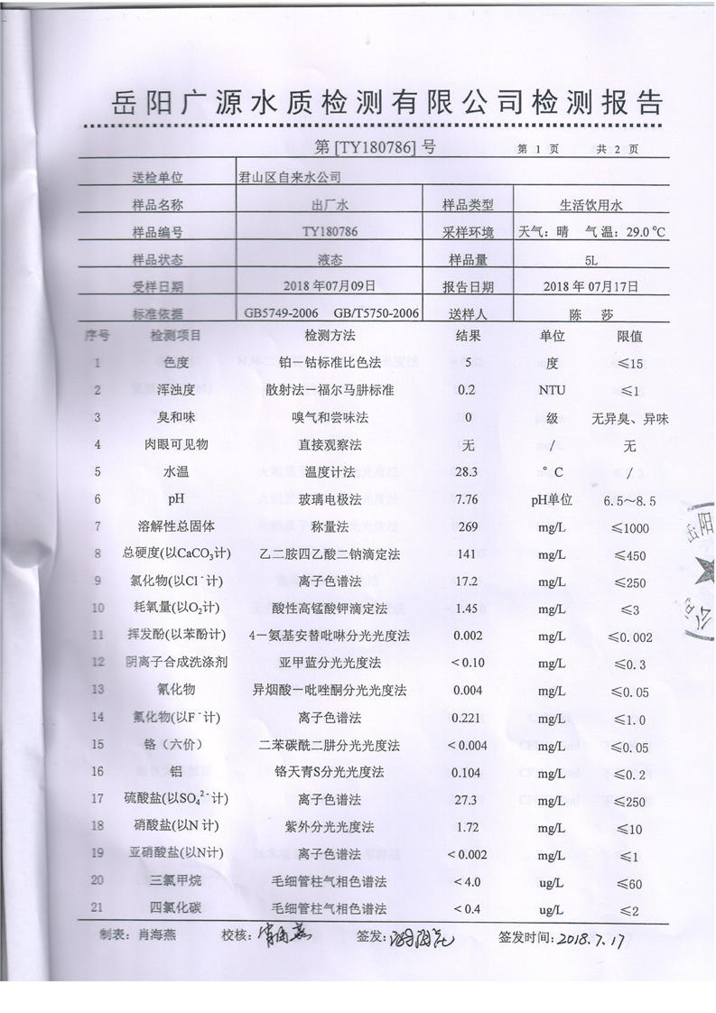君山區(qū)自來水公司2018年7月水質(zhì)監(jiān)測結(jié)果
