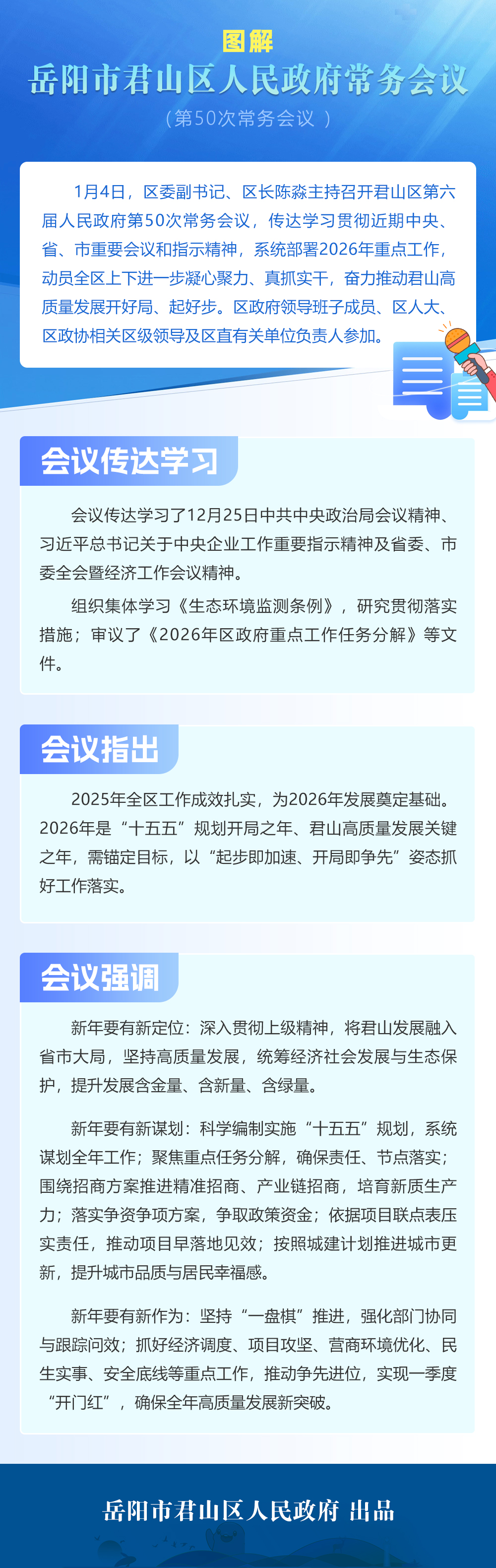 1月4日,區(qū)委副書記、區(qū)長陳淼主持召開君山區(qū)第六屆人民政府第50次常務(wù)會(huì)議,傳達(dá)學(xué)習(xí)貫徹近期中央、省、市重要會(huì)議和指示精神,系統(tǒng)部署2026年重點(diǎn)工作,動(dòng)員全區(qū)上下進(jìn)一步凝心聚力、真抓實(shí)干,奮力推動(dòng)君山高質(zhì)量發(fā)展開好局、起好步。區(qū)政府領(lǐng)導(dǎo)班子成員、區(qū)人大、區(qū)政協(xié)相關(guān)區(qū)級(jí)領(lǐng)導(dǎo)及區(qū)直有關(guān)單位負(fù)責(zé)人參加。