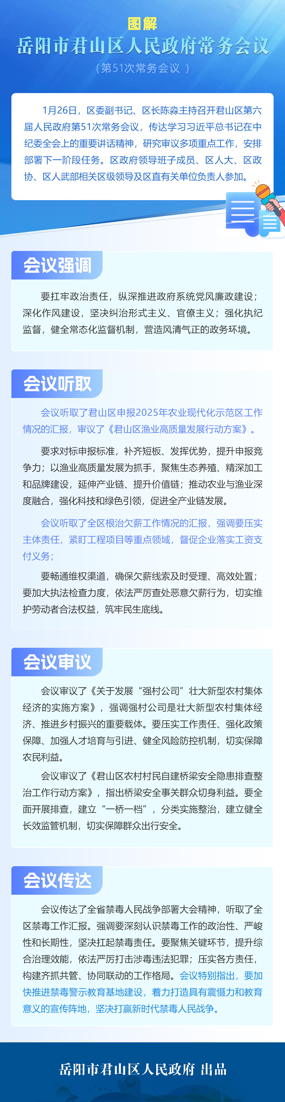 會(huì)議審議了《君山區(qū)農(nóng)村村民自建橋梁安全隱患排查整治工作行動(dòng)方案》,指出橋梁安全事關(guān)群眾切身利益。要全面開(kāi)展排查,建立“一橋一檔”,分類(lèi)實(shí)施整治,建立健全長(zhǎng)效監(jiān)管機(jī)制,切實(shí)保障群眾出行安全。