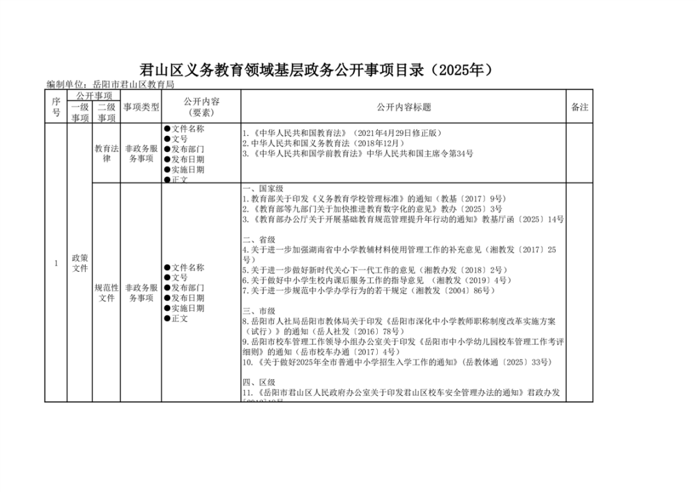 君山區(qū)義務(wù)教育領(lǐng)域基層政務(wù)公開事項(xiàng)目錄(2025年)